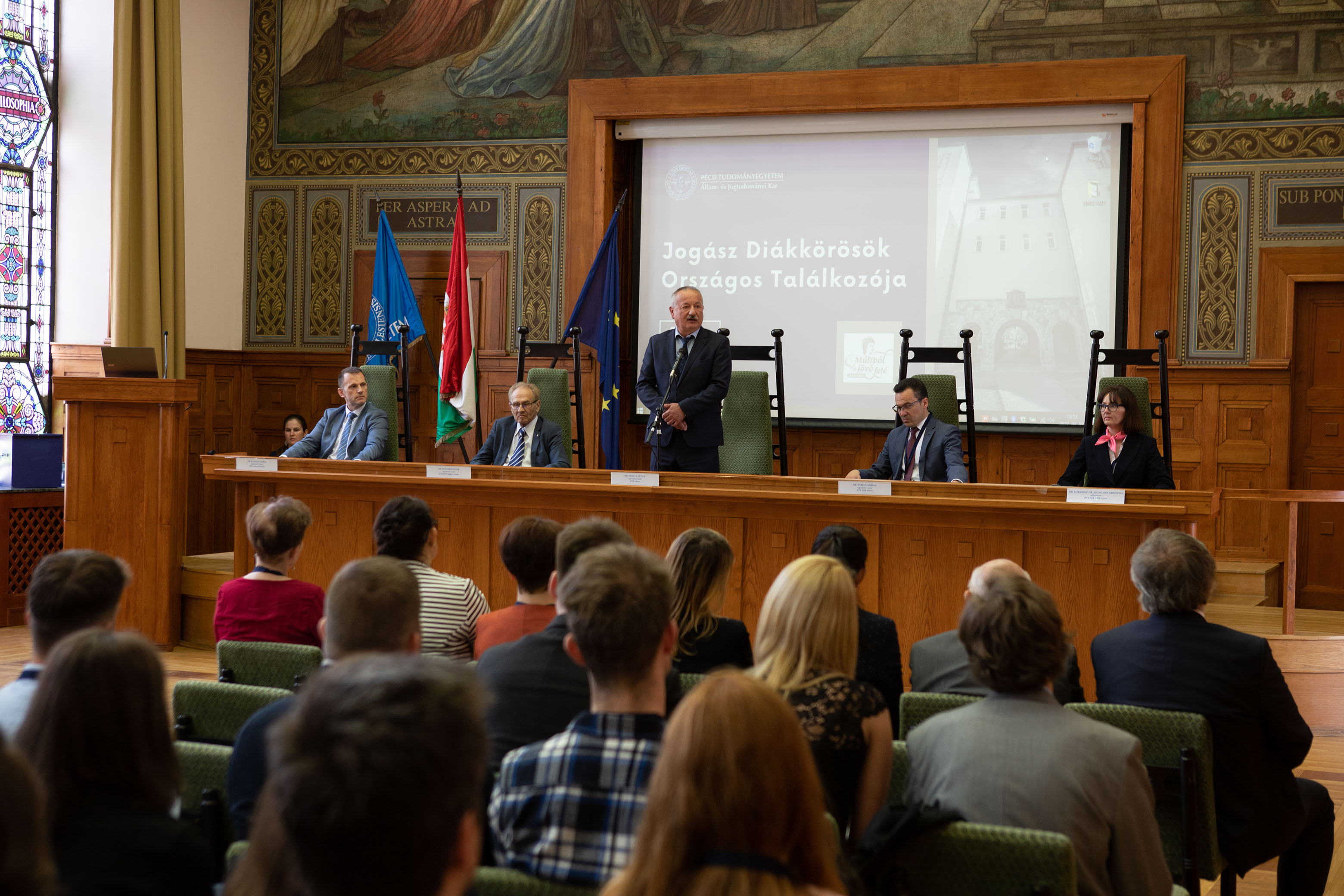 A megnyitó alkalmával a házigazdák – dr. Miseta Attila, a PTE rektora, dr. Fedeles Tamás rektorhelyettes, a Centenáriumi Programirányító Bizottság elnöke és dr. Fábián Adrián, a PTE ÁJK dékánja – mellett köszöntötte a résztvevőket dr. Szendrő Péter, az Országos Tudományos Diákköri Tanács örökös elnöke is. Ezt követően egy dal csendült fel üdvözlésképpen: Dienes Rebeka Eszter negyedéves joghallgató Paulina Ajándék című dalát adta elő.