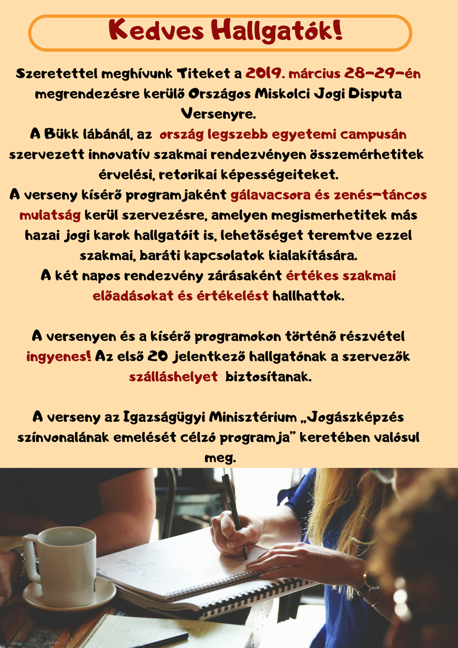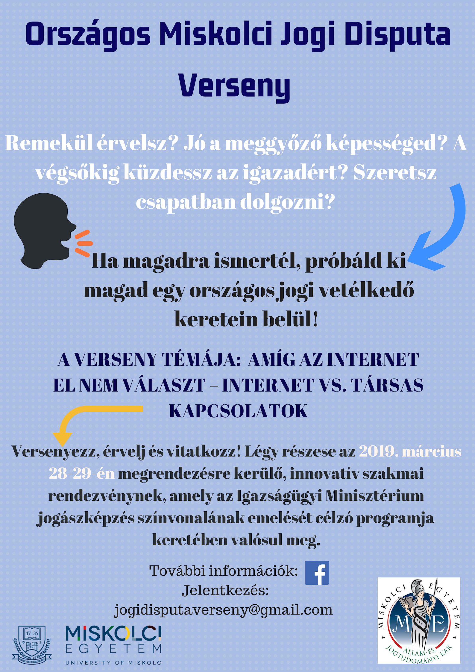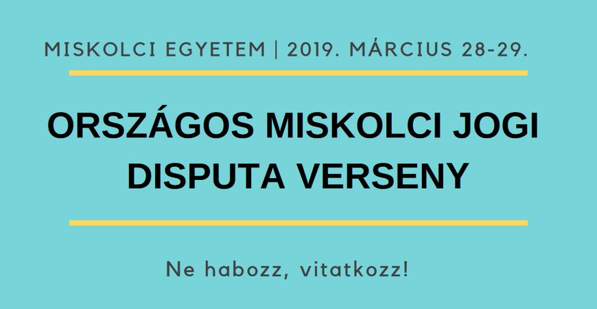 2019. március 28-29-én az Igazságügyi Minisztérium támogatásával megrendezésre kerül az Országos Miskolci Jogi Disputa Verseny a Miskolci Egyetem Állam- és Jogtudományi Karán.