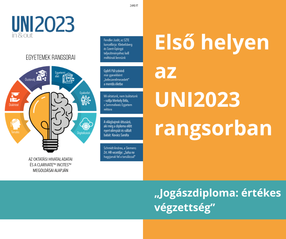 Az UNIside az UNI2023 in&out kiadványban az idei évben is megjelentette a hazai egyetemek rangsorát, melyben a jogi képzési területen az első helyen szerepel karunk.