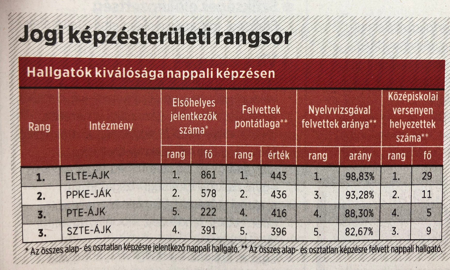 Az elmúlt évekhez hasonlóan a HVG Diploma 2024 különszáma rangsorolta a hazai felsőoktatási képzőhelyeket. A két nagy budapesti képzőhely mögött a Pécsi Tudományegyetem Állam- és Jogtudományi Kara az idei évben újra kiérdemelte a legjobb vidéki képzőhely státuszt a hallgatók kiválósága alapján, a jogász osztatlan képzésben.