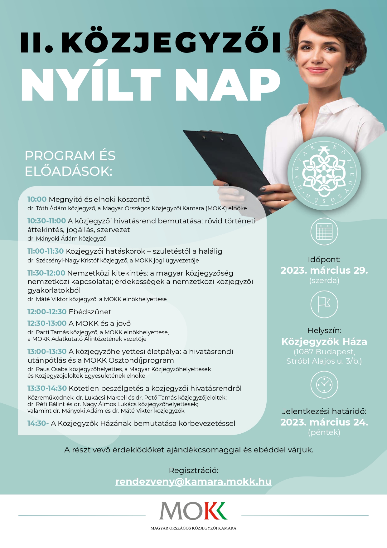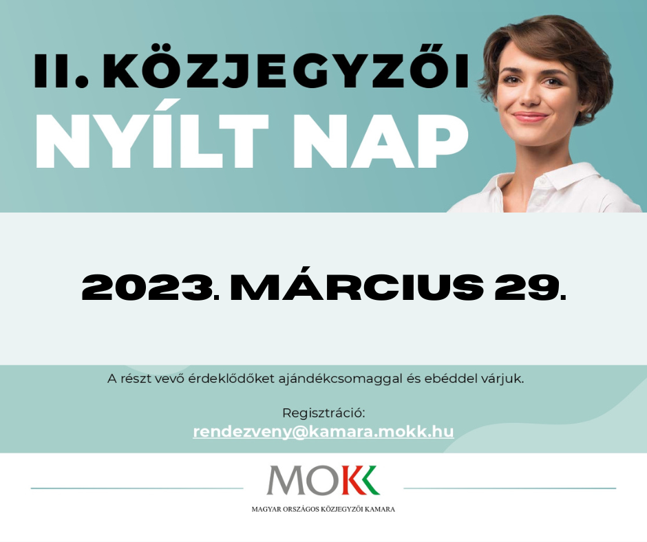 A MOKK és a Magyar Közjegyzőhelyettesek és Közjegyzőjelöltek Egyesülete 2023. március 29-én közösen rendezi meg a II. Közjegyzői Nyílt Napot, melynek keretében a szakmában járatos és elismert kollégák mutatják be a pályaválasztás előtt álló joghallgatók részére a közjegyzői életpálya előnyeit, különlegességét. A rendezvény célja, hogy betekintést nyújtsunk a közjegyzői hivatásrend működésébe, és a hallgatók megismerhessék a közjegyzői kamara működését, a közjegyzői hatáskörbe tartozó nemperes eljárásokat.