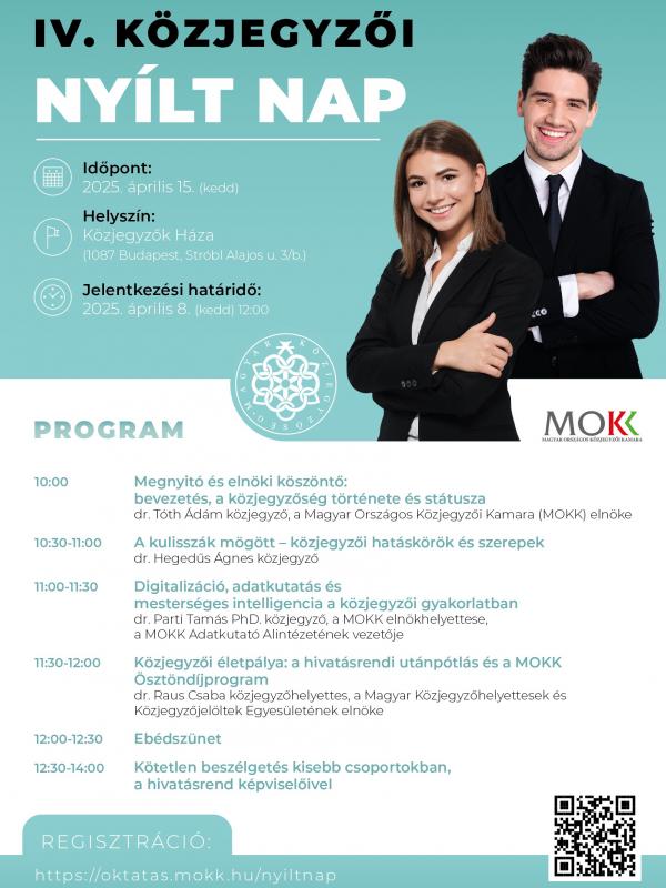 A Magyar Országos Közjegyzői Kamara (MOKK) 2025. április 15-én ismét megrendezi a Közjegyzői Nyílt Napot, amely kiváló lehetőség a joghallgatók és a jogi pálya iránt érdeklődők számára, hogy közelebbről megismerjék a közjegyzői hivatás világát. Az eseménynek a budapesti Közjegyzők Háza ad otthont (1087 Budapest, Stróbl Alajos u. 3/b.).