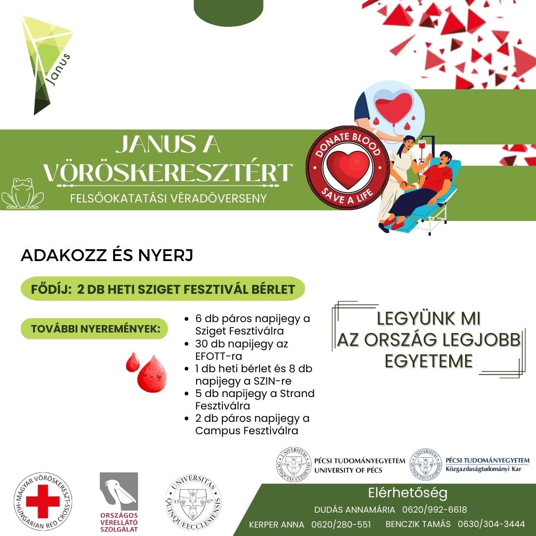 A Janus Pannonius Közgazdasági Szakkollégium (JPKSZ), a Pécsi Tudományegyetem, a Magyar Vöröskereszt, valamint az Országos Vérellátó Szolgálat (OVSz) az Országos Felsőoktatási Véradóverseny keretein belül első alkalommal rendezi meg a „Janus a Vöröskeresztért” véradó eseményét május 3.-án 9:00-tól 12:00-ig a PTE KTK 323/1. (7622 Pécs, Rákóczi út 80.) termében.