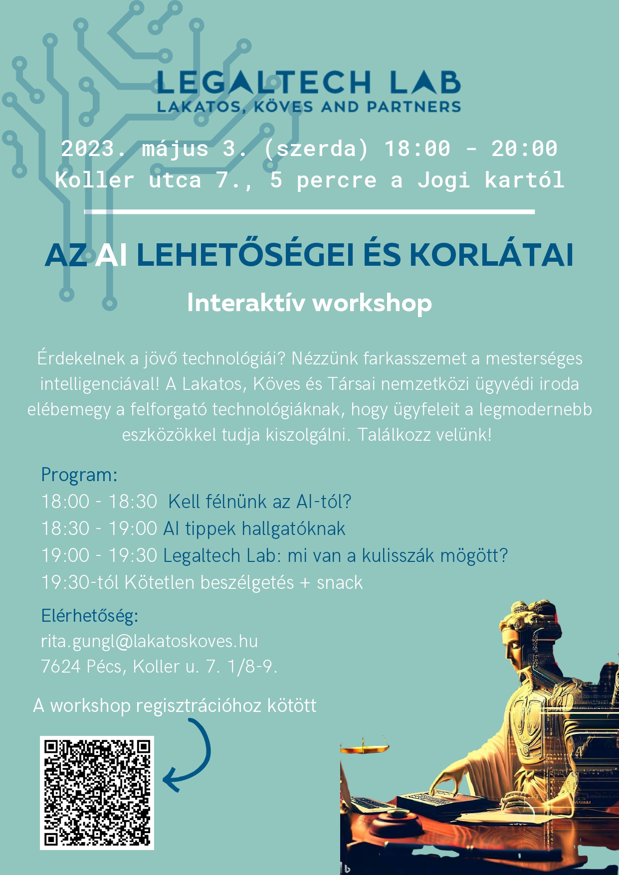 A workshop témája a mesterséges intelligencia lehetőségei és korlátai. Szó esik majd arról, hogy kell-e félnünk az AI-tól, valamint milyen területeken tud segíteni a hallgatóknak. Továbbá bemutatják, hogy mivel foglalkozik az iroda, milyen technológiai megoldásokkal segítik az ügyvédek munkáját, végül egy kötetlen beszélgetéssel és snackkel zárják az estét.