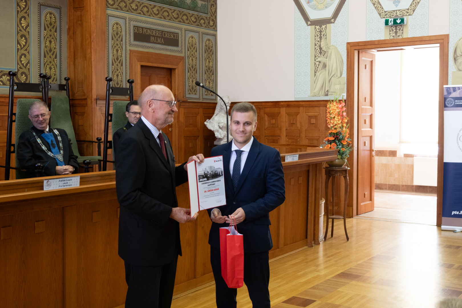 A Pécsi Tudományegyetem Tanévnyitó Ünnepi Szenátusi Ülésén 2023. szeptember 1-én, Dr. Hohmann Balázs a Kar adjunktusa Alma Mater Emlékérem kitüntetést vehetett át, míg dr. Szijártó István doktorandusz hallgatónk Pro Universitate Juventutis Díjban részesült.