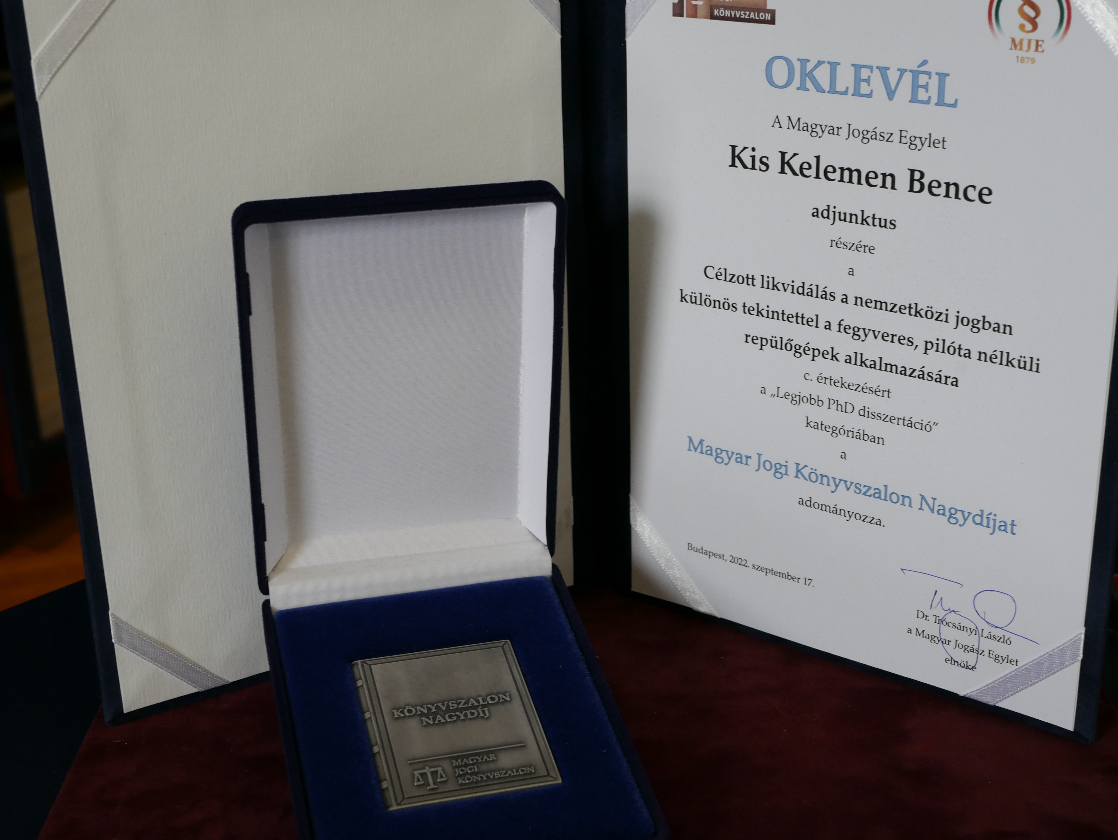 A legjobb PhD disszertációt odaítélő bíráló bizottság elnöke Sulyok Tamás, az Alkotmánybíróság elnöke volt. A jelöltek között karunk adjunktusa, dr. Kis Kelemen Bence kapta meg a Magyar Jogi Könyvszalon Nagydíját „Célzott likvidálás a nemzetközi jogban különös tekintettel a fegyveres, pilóta nélküli repülőgépek alkalmazására c. értekezésével.