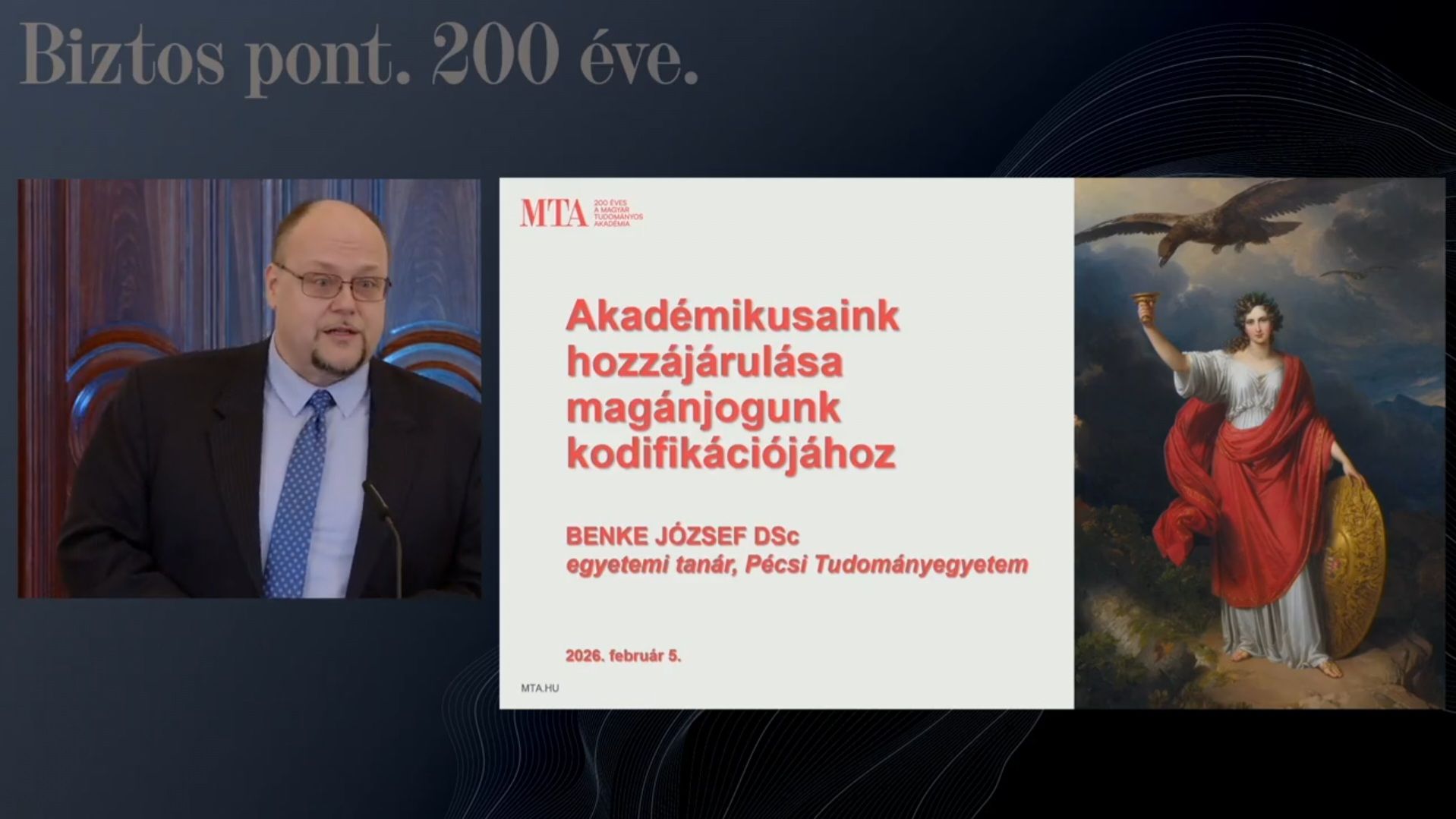 Prof. Dr. Benke József, Polgári Jogi Tanszékünk egyetemi tanára, az MTA doktora Karunk képviseletében 2026. február 5-én az MTA Székház Felolvasótermében előadást tartott a Magyar Tudományos Akadémia alapításának 200. évfordulója alkalmából szervezett ünnepségsorozat jogtudományi nyitókonferenciáján. A magyar magánjog tudományterületét Vékás...